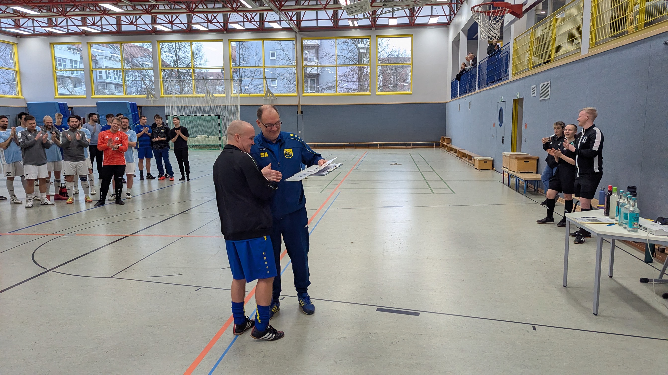 Am Samstag, 17.01.26 fand in der großen Sporthalle in der Woelckpromenade unser vereinsinternes Hallenturnier statt. Vor den Augen Ihrer Kinder und Familienmitglieder kickten unsere blaugelben Fußballerinen und Fußballer der Damen, Männer, Freizeit und Seniorenteams mit viel Leidenschaft und Spaß. Ein großes Miteinander der älteren Haudegen mit den jungen Wilden und ein Wiedersehen von Spielerinnen und Spielern, die sich lange kennen, aber durch unterschiedliche Trainingstage eher selten sehen. Abteilungsleiter Stefan Andrzejewski hatte das sportliche ebenso perfekt organisiert, wie Mario das kulinarische. So lief alles perfekt und die Stimmung war von Anfang bis Ende richtig toll. Sportlich ging es in den Platzierungsspielen leidenschaftlich zur Sache, gut überwacht von unserer jungen Schiedsrichterin Mia und unserem erfahrenen Schiri Philipp, denen wir für Ihren Einsatz herzlich danken.